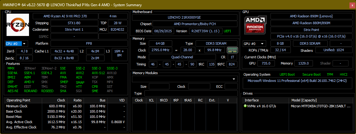 | Lenovo ThinkPad P16s Gen 4 21RX000YGE Ryzen AI 9 HX PRO 370, Radeon 890M, Micron 3500 1TB MTFDKBA1T0TGD, IPS LED, 1920x1200, 16" | Lenovo ThinkPad P16s G2 21K9000CGE R7 PRO 7840U, Radeon 780M, SK hynix PC801 HFS001TEJ9X162N, OLED, 3840x2400, 16" | HP ZBook X G1i 16 Ultra 7 265H, RTX PRO 2000 Blackwell Generation Laptop, Samsung PM9A1 MZVL22T0HBLB, IPS, 2560x1600, 16" | Lenovo ThinkPad P1 Gen 8 Ultra 7 255H, RTX PRO 2000 Blackwell Generation Laptop, Samsung PM9E1 1 TB MZVLC1T0HFLU, Tandem OLED, 3200x2000, 16" | Dell Precision 5690 Ultra 9 185H, RTX 5000 Ada Generation Laptop, 2x Samsung PM9A1 1TB (RAID 0), OLED, 3840x2400, 16" | Average AMD Radeon 890M | Average of class Workstation | |