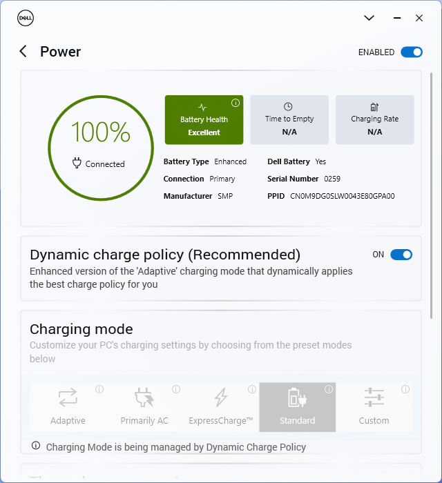 尽管中小型(约 12.2 x 5.9 x 2.7 厘米)USB-C 交流适配器的额定功率仅为 100 瓦,但我们仍能记录到 110 瓦的最大功耗。不过,由于酷睿 H 系列处理器具有更高的 Turbo Boost 潜能,它比我们在 Inspiron 16 7635 2 合 1 上记录的功率要高得多。