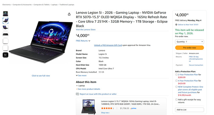 与此同时,X 用户 Huang514613 在加拿大 Cendirect 和美国亚马逊上发现了不同版本的产品,售价为 4000 美元。如下图所示,联想上市的Legion 5i 配备 15.3 英寸 OLED 显示屏、1 TB 存储空间和 32 GB 内存,外观为日蚀黑。换句话说,这与现有的 Panther Lake 机型的硬件相匹配。