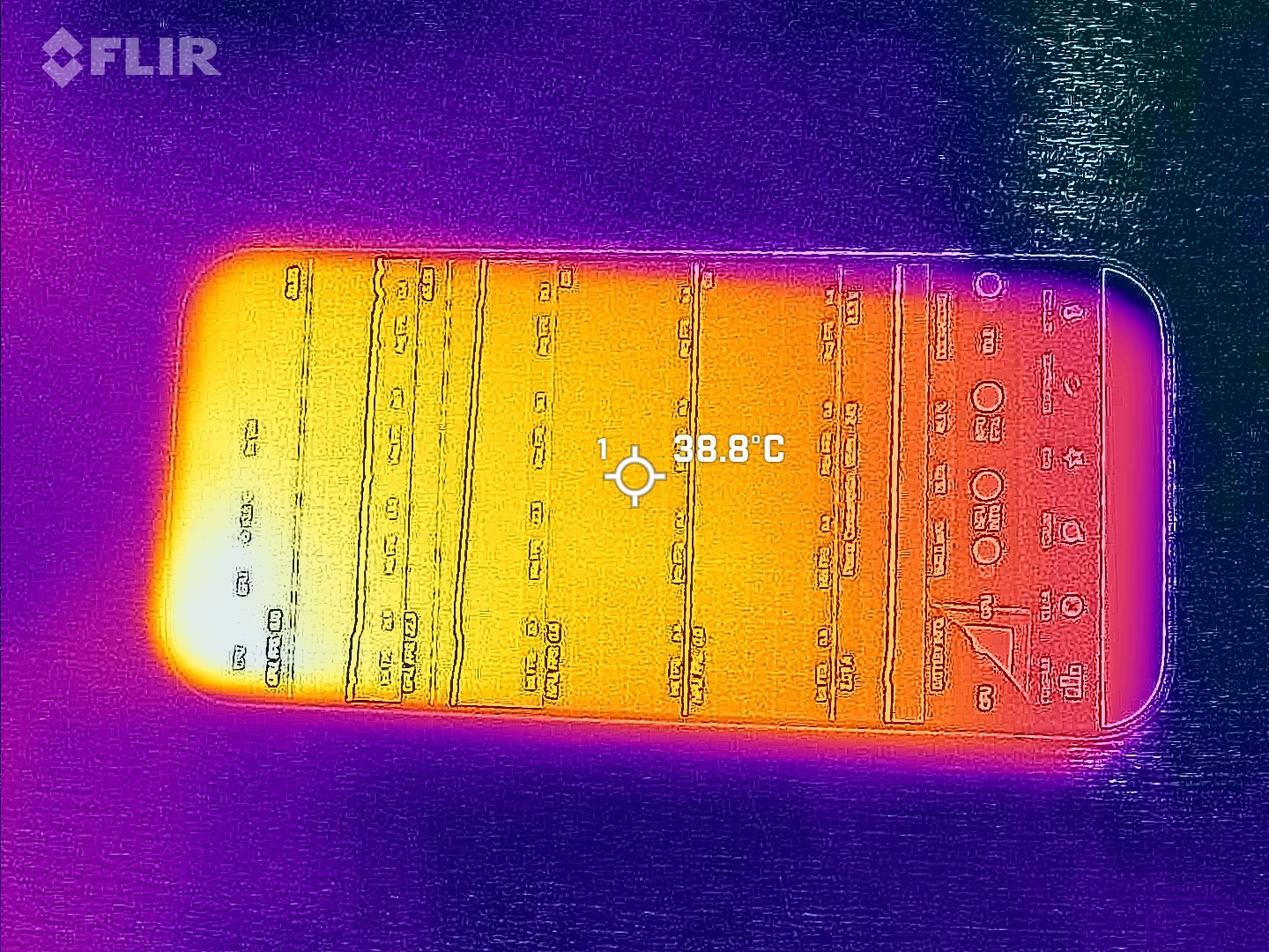 (-) The bottom heats up to a maximum of 49.2 °C / 121 F, compared to the average of 34 °C / 93 F