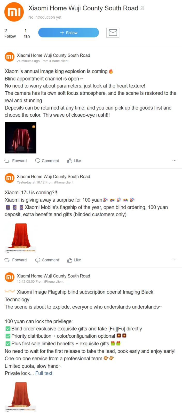 根据小米专卖店在微博上的宣传,中国智能手机粉丝如果想购买明年最令人兴奋的旗舰手机之一,现在就可以支付 100 元(约合 14 美元)定金,提前预订小米 17 Ultra。.在众多相关帖子中,有一条甚至明确提到了这款尚未发布的手机,称 "小米 17U 要来了吗!!",尽管目前还是 "盲订"。