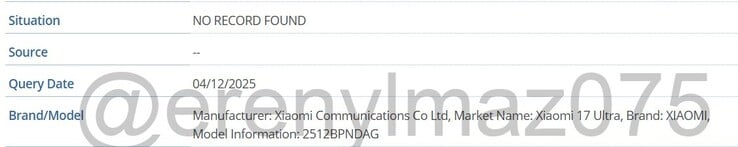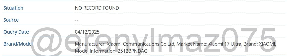 传言有传言称,新的潜望镜模块包含的不仅仅是一个简单的长焦镜头,而是一个真正的可变焦距光学变焦摄像头,不过这一点尚未得到证实。可以肯定的是,我们现在可以期待在欧洲看到小米 17 Ultra 了。虽然大多数观察家已经预料到了这一点,但正如下面的截图所示,IMEI 数据库中首次发现了编号为 2512BPNDAG 的全球机型。因此,我们预计小米 17 Ultra 将于 12 月在中国发布,2026 年 3 月在全球发布。