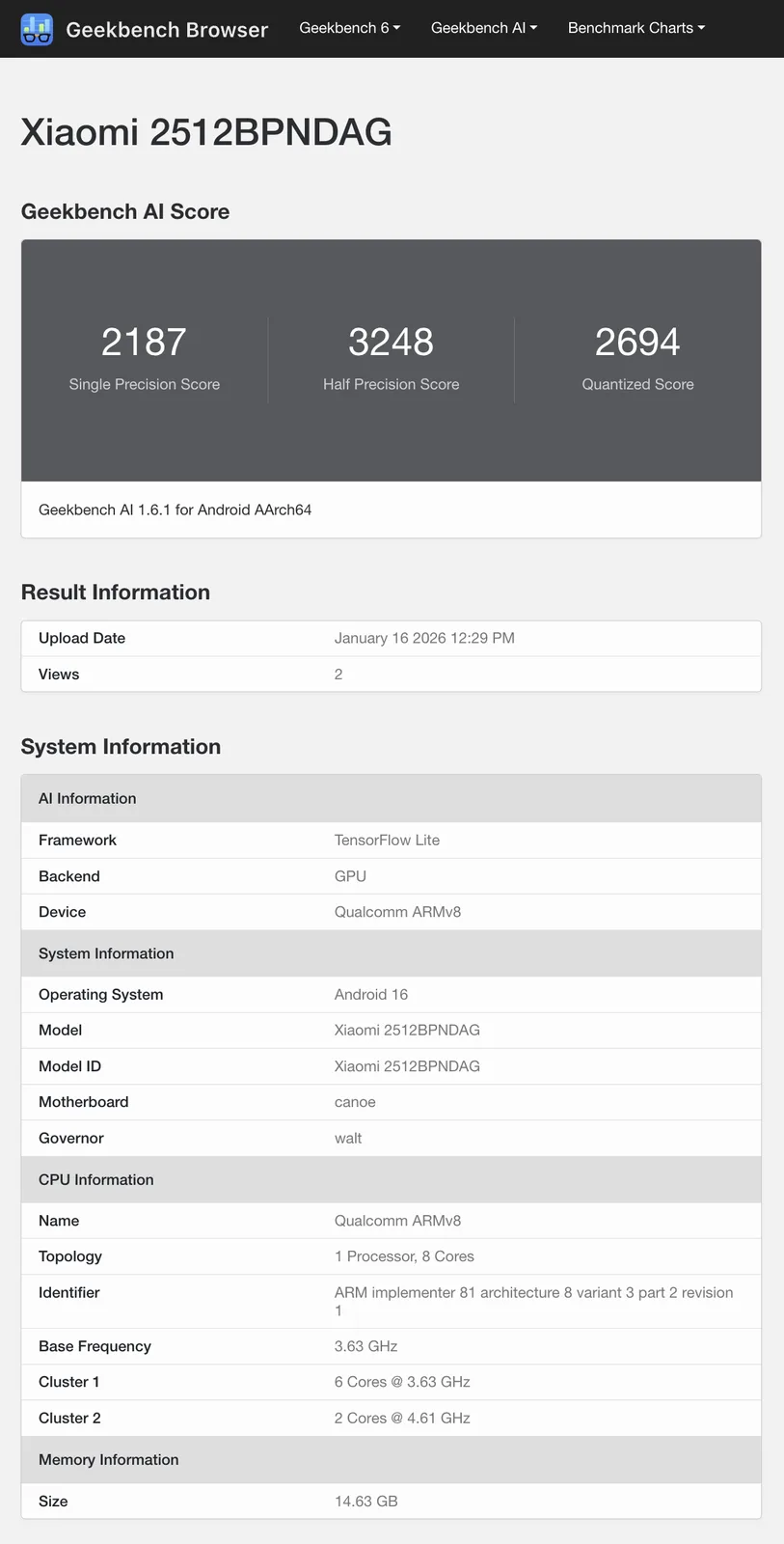 不过,全球版本的 小米 17 Ultra现已出现在 Geekbench 上。全球版本的型号为 2512BPNDAG,目前预计只有小米 17 在中国以外的地区上市。不出所料,小米 17 Ultra 仍采用了 高通骁龙 8 精英 5 代芯片组。此外,该设备在中国以外地区将从一开始就运行Android 16,这与最近的 小米 15T Pro(亚马逊当前售价 844.50 美元)不同。