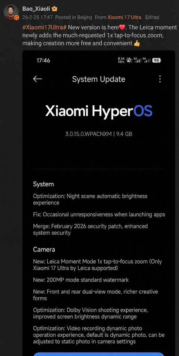 一方面,HyperOS 3.0.15.0.WPACNXM 引入了徕卡即时模式 1x 轻触变焦,这种相机模式以前仅限于徕卡版。另一方面,新更新还完善了小米的双视角模式,为 200 MP 模式添加了标准水印,并优化了启用杜比视界拍摄时的动态范围。遗憾的是,这些功能是否会随小米 17 Ultra 在全球推出,以与新的Galaxy S26 Ultra 竞争,我们拭目以待。