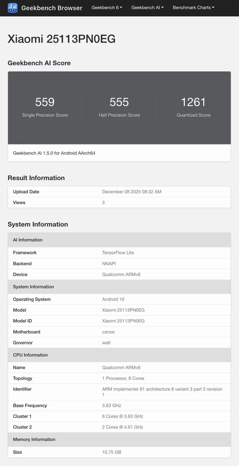 具体来说,小米已经认证了 小米 17在泰国国家广播电视和电信委员会(NBTC)获得了销售认证。最终,NBTC 只将 25113PN0EG 与小米 17 联系起来。不过,这个全球型号同时出现在 Geekbench 上。从这个列表中,我们可以得出全球小米 17 将采用常规的 骁龙 8 精英 5 代芯片组。不仅如此,小米 17 在国际上也将以 12 GB 内存起步。