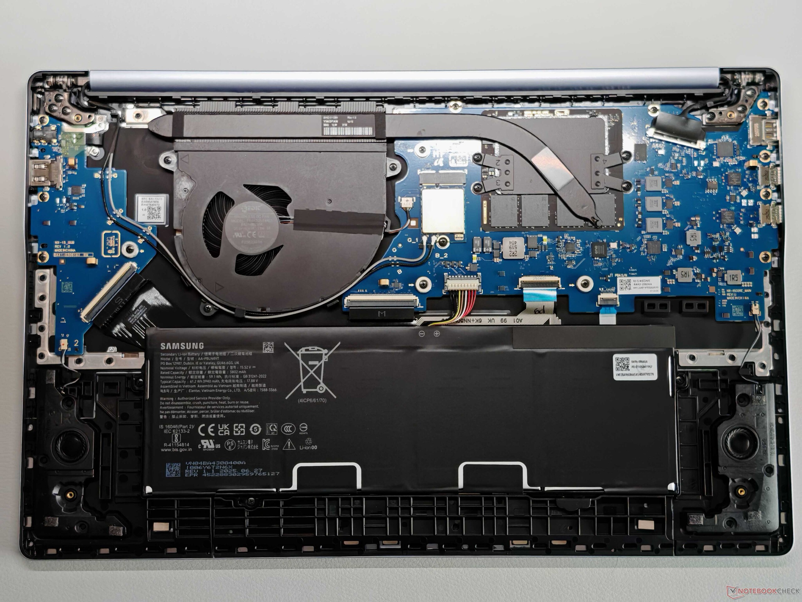 三星为Galaxy Book4 Edge 采用了纤薄的金属外壳,厚度为 1.5 厘米,重量为 1.49 千克,可以轻松放入任何背包。外壳颜色为蓝宝石蓝色,是一种非常浅的蓝色(相当银色,略带蓝色)。从外观上看,这款笔记本非常漂亮,质量也不错。只是显示屏铰链(最大开启角度为 180 度)有些过于光滑,因此会有轻微晃动。下机箱盖可以拆卸(橡胶脚下有螺丝),但维护选项仅限于清洁风扇、WLAN 模块和电池,必要时可以更换电池。