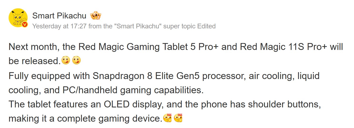 现在,来自著名泄密者 Smart Pikachu 的一份最新报告显示,这款游戏平板电脑即将面世。该产品计划于 2026 年 5 月发布,RedMagic 通常会在中国首发后不久在全球发布其产品。