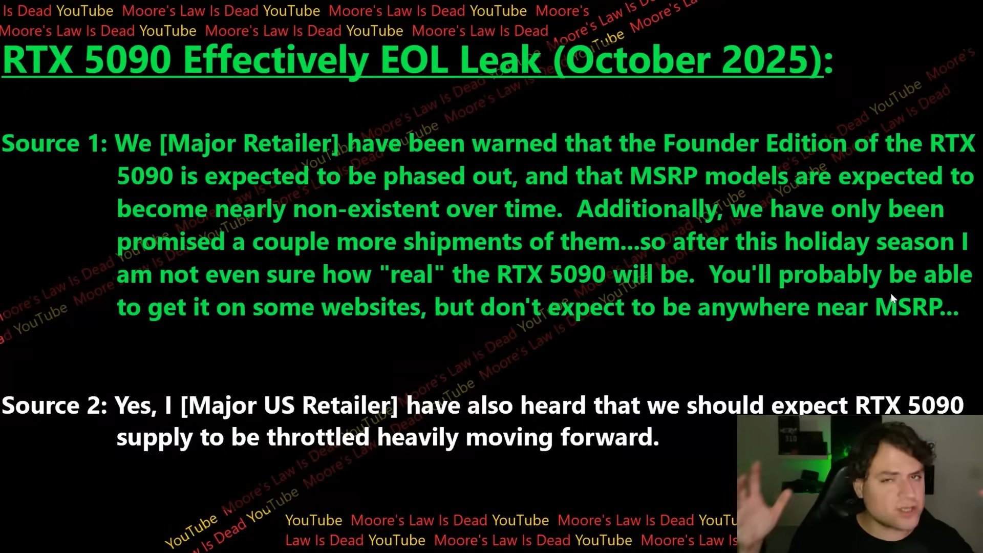 根据一位在 "主要零售商 "工作的 MLID 消息来源,RTX 5090 Founders Edition "预计将被逐步淘汰"。其他 MSRP 型号的供应似乎也在减少,以至于不复存在。消息人士警告说,2025 年假日季过后,价格合理的 RTX 5090 型号,如零售价或接近 MSRP 的型号,很可能会停止流通。