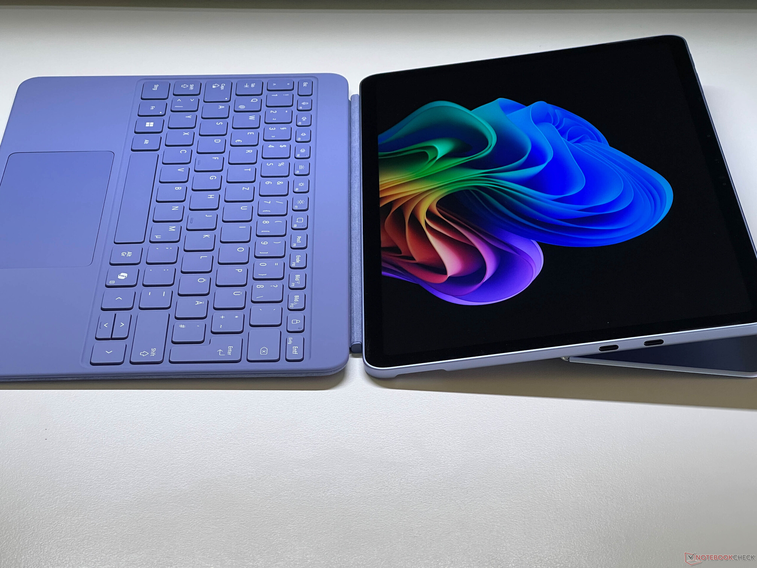 Surface Pro 12 的外壳由铝合金制成(有紫色、铂金色或海洋色可选),触感非常高级,具有非常好的制造质量和稳定性。内置的脚架非常稳固,最大开启角度可达 165 度。虽然配置包括 Wi-Fi 7 和适当的快速传输速度,但两个 USB-C 端口仅限于 USB 3.2 Gen.既没有读卡器,也不能更换 UFS 存储。前置的 1080p 网络摄像头(带面部识别功能)拍摄的图像并不特别出色;后置的 1000 万像素摄像头则明显更胜一筹。这是一款 Copilot+ 设备。平板电脑本身重 682 克(厚 7.8 毫米),加上键盘盖后重 1,023 克(厚 13 毫米)。