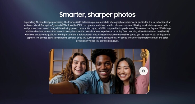 三星还展示了集成图像信号处理器(ISP)中基于 AI 的全新视觉感知系统(VPS)。该 VPS 可以识别自拍时主体眨眼等场景。另一个值得注意的新增功能是降噪系统,旨在增强低光相机性能。即使进行了所有这些升级,新 ISP 的功耗仍比 Exynos 2500 的前代产品低 50%。由于支持 AVP 编解码器,三星希望在专业视频录制领域建立起AppleProRes 的替代产品。Exynos 2600 还支持分辨率高达 320 MP 的摄像机。