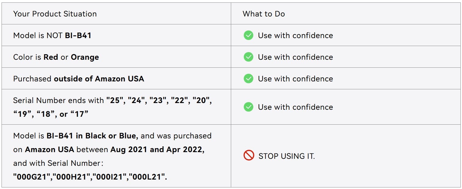 Iniu 还补充说,只有序列号相符的黑色和蓝色配色受到影响。其他颜色(橙色和红色)可以放心使用。