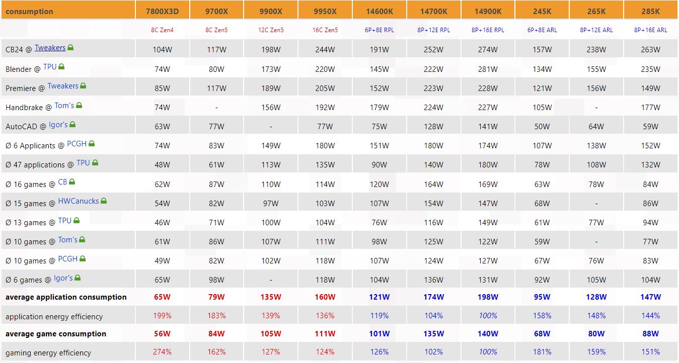 根据 3DCenter 编制的数据,Core Ultra 9 285K 在应用工作负载中的平均功耗仅为 147 W,而 Core i9-14900K 为 198 W,Ryzen 9 9950X 为 160 W。 Ryzen 9 9950X.如此低的能耗也使得Arrow Lake 旗舰芯片的应用能效比 Core i9-14900K 和 Ryzen 9 9950X 分别高出 44% 和 6%。