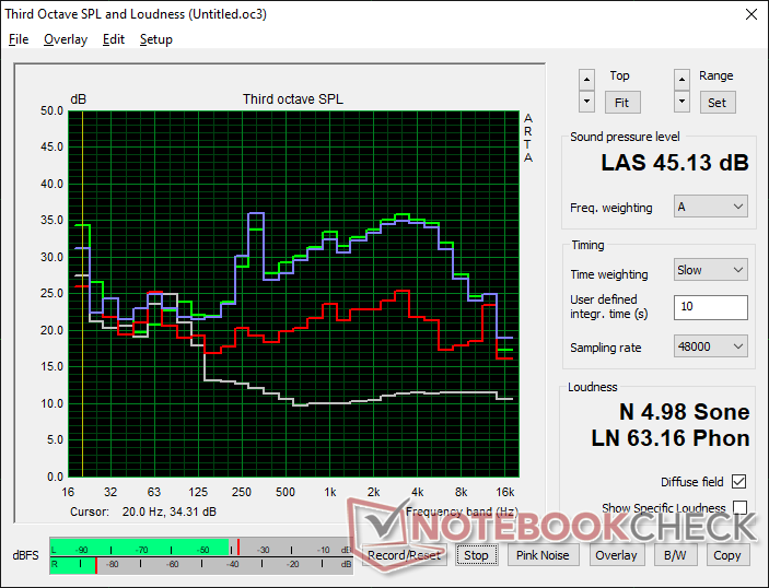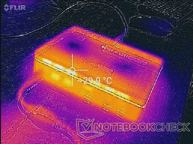 GTR5是我们测试过的最响亮的迷你电脑之一,因为它的两个内部风扇基本上一直在活动。例如,当简单地坐在Windows桌面屏幕上时,我们已经能够记录到34.2 dB(A)的风扇噪音,而GMK NucBox 2或英特尔NUC11PAQi7的CPU功率都较小,只有约25 dB(A)。