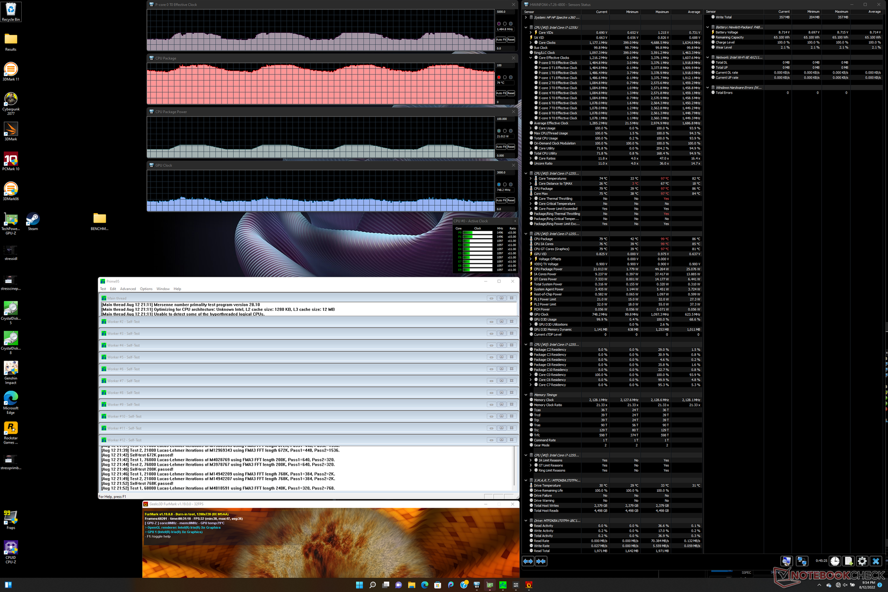 当在性能模式下运行Prime95时,CPU时钟频率、温度和电路板功耗将在最初几秒钟内分别飙升至3.2 GHz、99 C和44 W,然后稳步下降并稳定在2.8 GHz、97 C和28 W。核心温度将保持非常高,表明冷却解决方案被推到极限,以适应要求苛刻的Alder Lake CPU。然而,我们很欣赏这次的性能和温度至少是稳定的,而不是在重复同样的情况下的循环行为。 在2020 -U模型上重复同样的压力测试时的循环行为。2020Tiger Lake-U模型上重复同样的压力测试时的循环行为。在平衡模式下,CPU时钟速率、温度和功耗都会进一步下降,分别为2.0GHz、75C和18W。