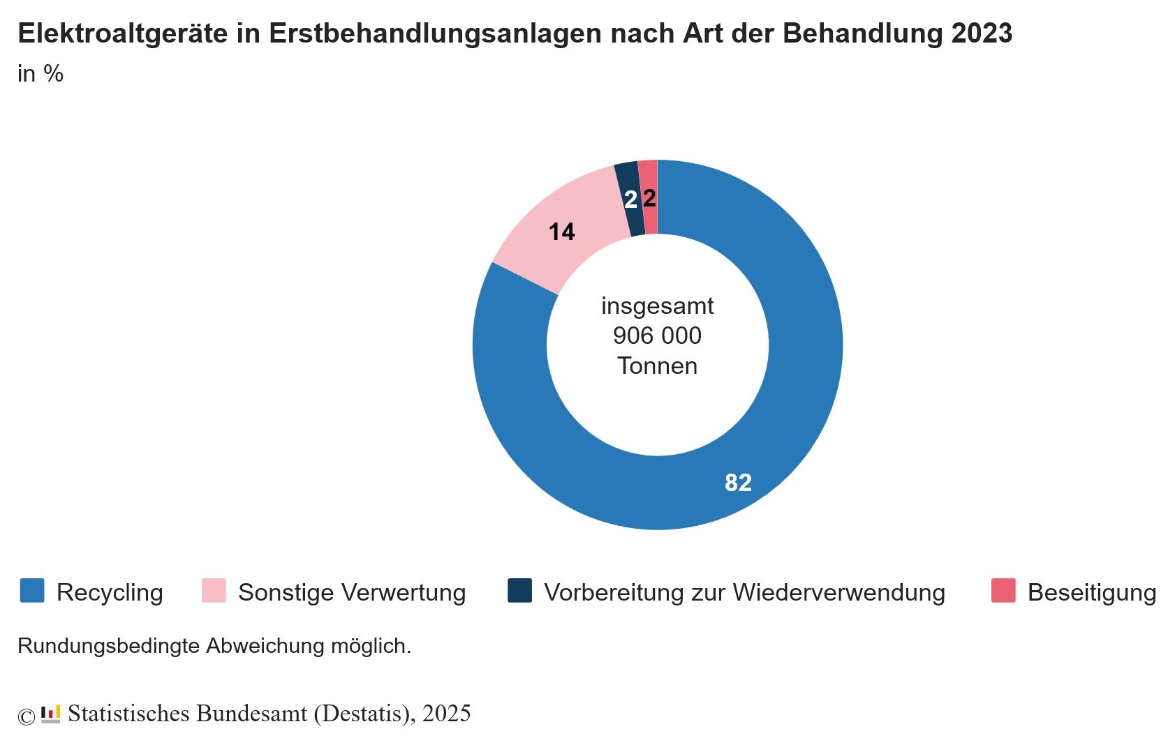在德国,电子废弃物的回收利用仍然是原材料转型的一个非常重要的问题。根据德国联邦统计局(Destatis)的数据,2023 年,90.61 万吨电子垃圾在经过认证的初级处理设施中得到处理。其中,74.7 万吨被回收,回收率为 82.4%。