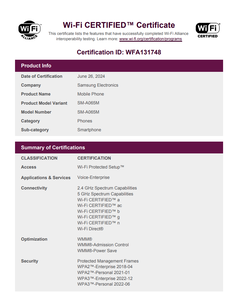 根据FCC 的新文件,它的新型号为 SM-A065F/DS。Wi-Fi Alliance 证实了这一发现。该联盟也公开称该设备为Galaxy A06,并补充说它还将以 SM-A065M 或 SM-A065M/DS 的名称推出。