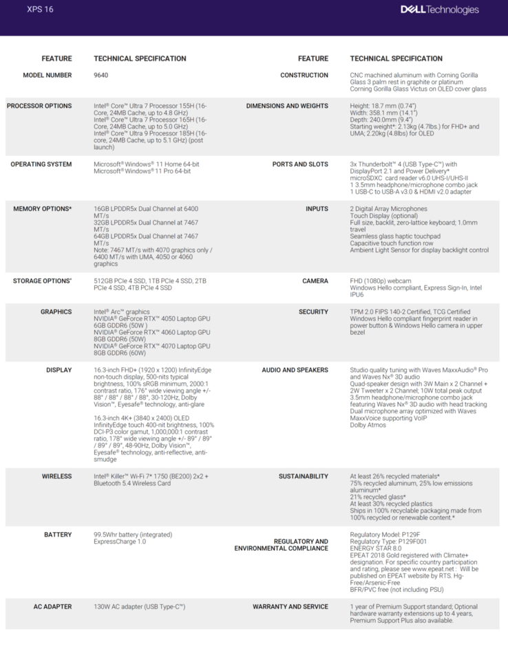 全新戴尔 XPS 系列的最后一款笔记本电脑是 XPS 16 9640.作为其中最高端的机型,它最高可配置 英特尔酷睿至尊 9 185H处理器和 Nvidia RTX 4070 GPU。.基本售价为 1899 美元,在官方网站上有多种配置可供选择。