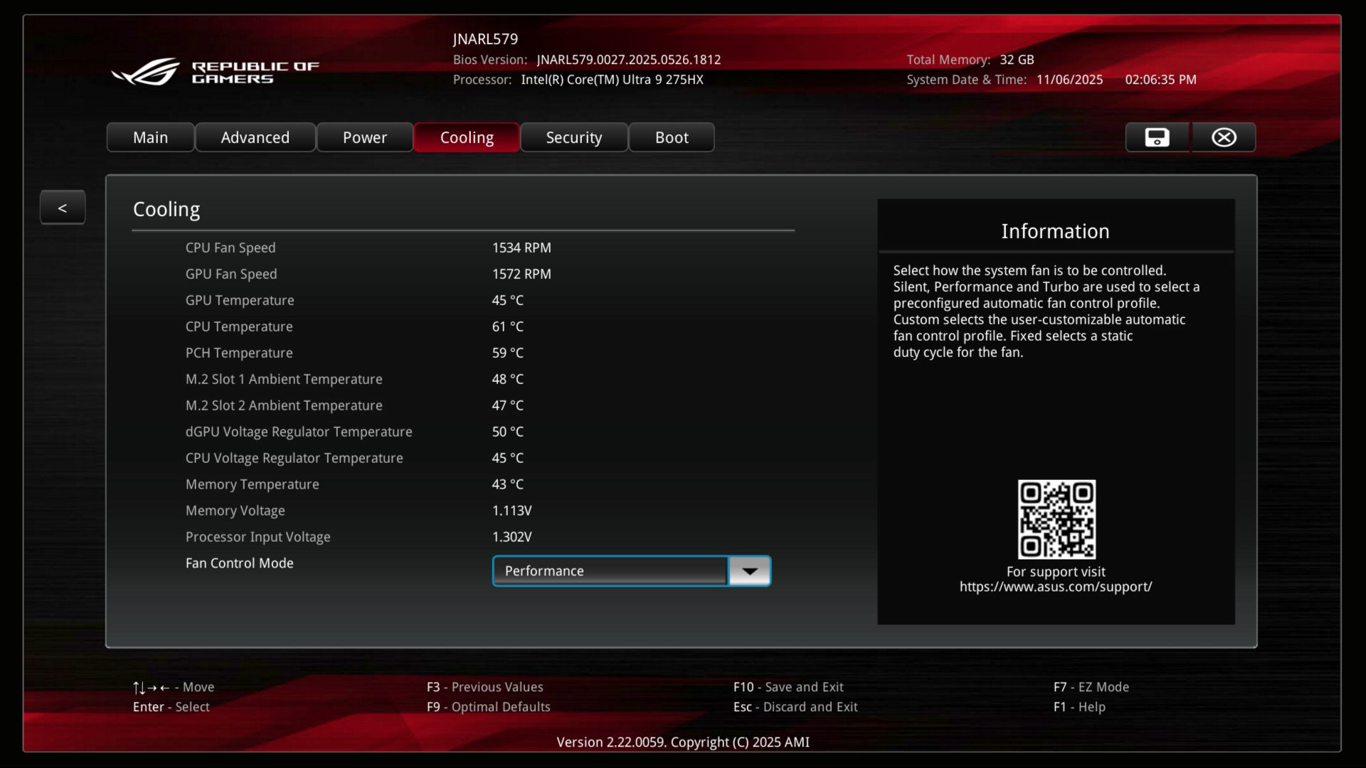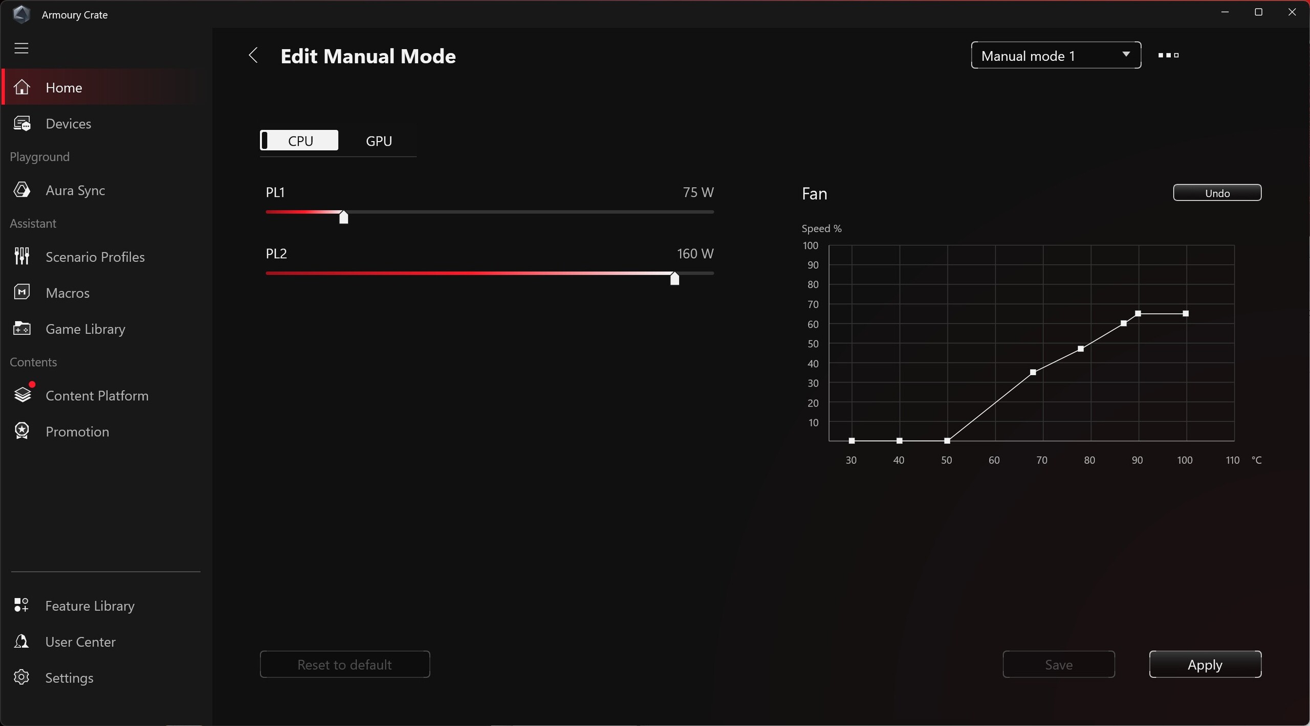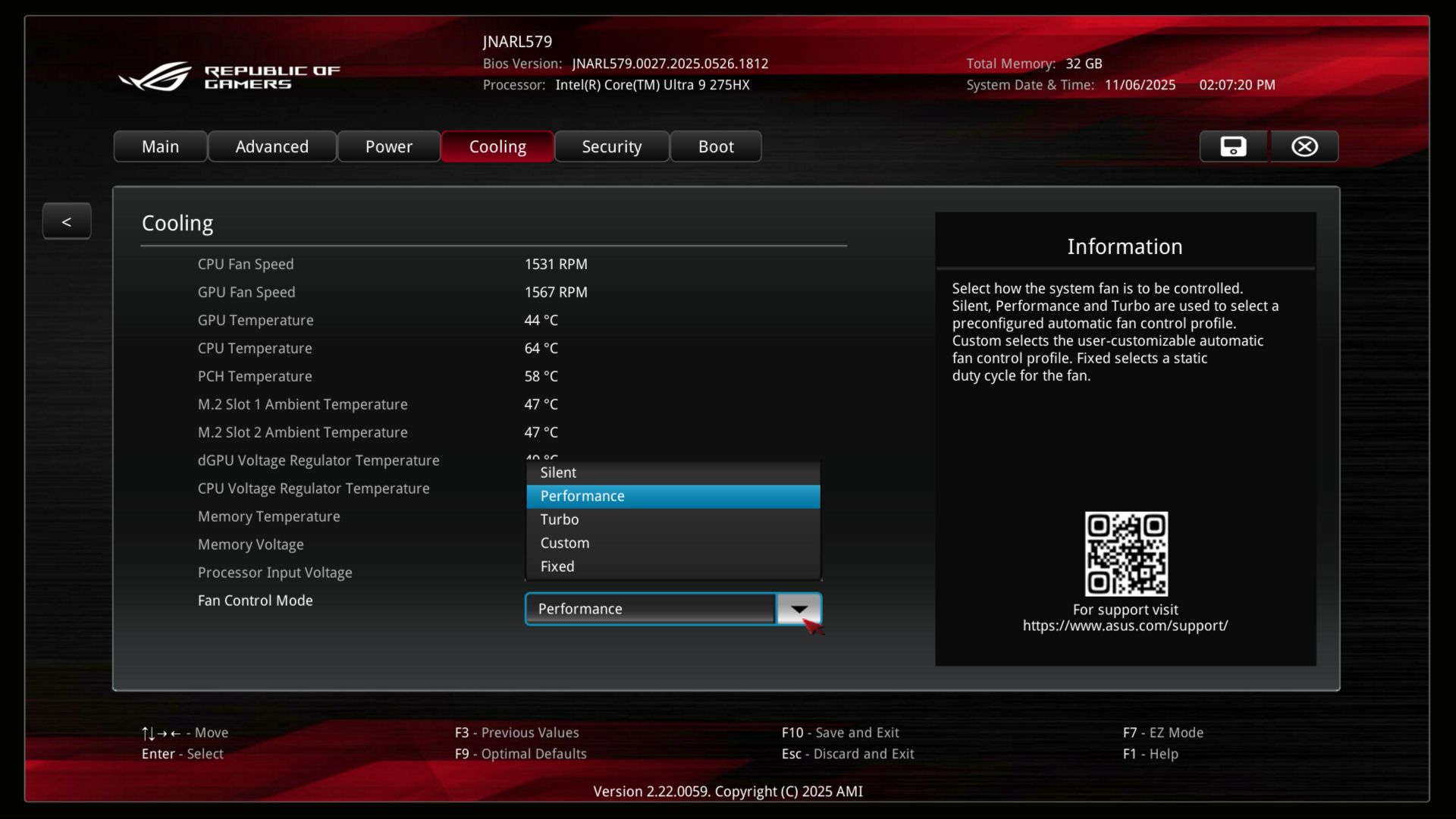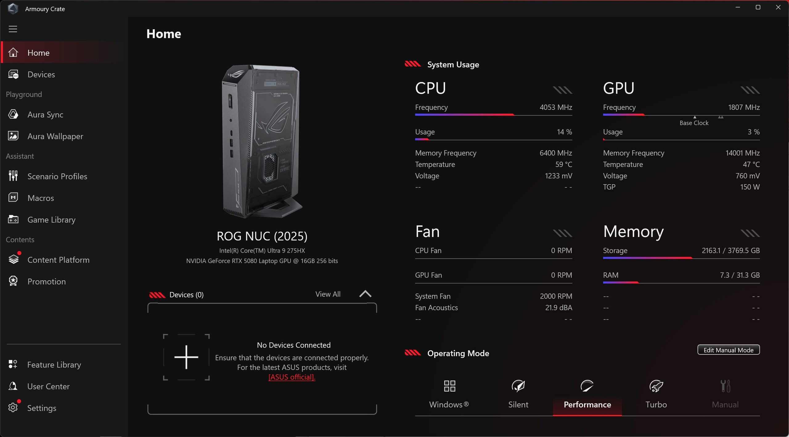 我们使用 "性能 "能源配置文件对该设备进行了所有性能测试。设计广泛的 UEFI 为定制设备提供了广阔的空间。可以选择各种性能配置文件和风扇配置文件。在 Windows 操作系统中,也可以使用著名的 Armoury Crate 工具轻松调整性能。