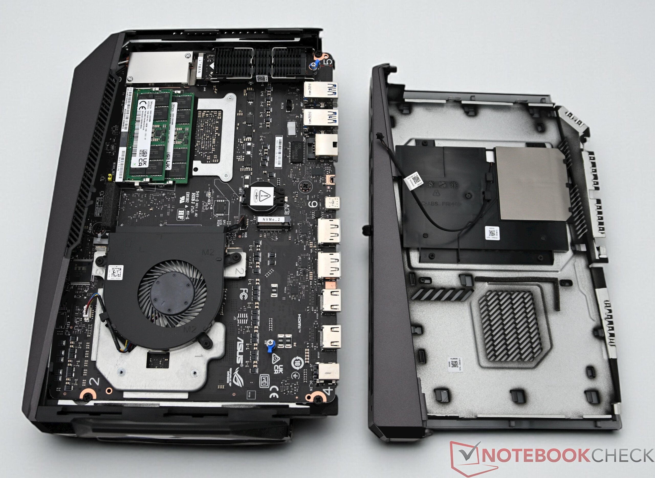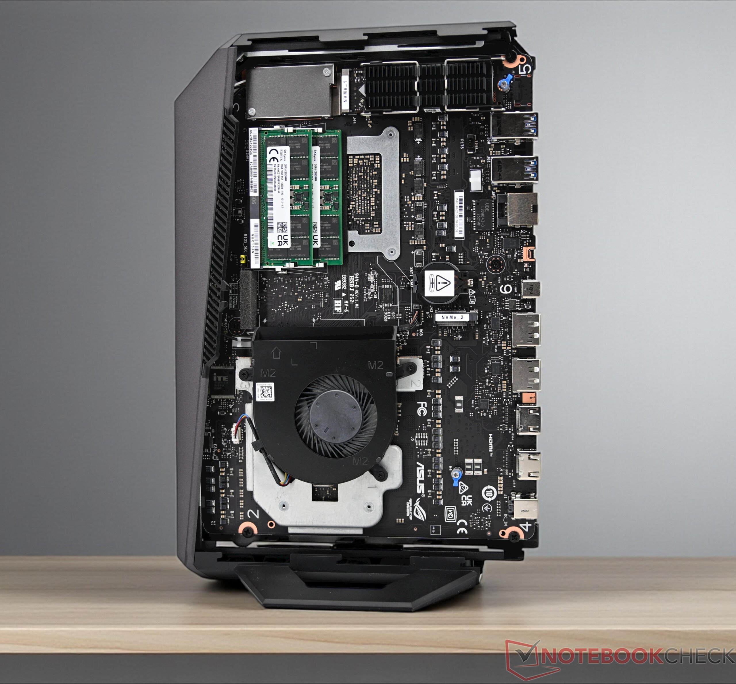 华硕 ROG NUC 15 的维护工作没有任何问题。华硕省去了复杂的螺丝连接,因此内存和固态硬盘都很容易接近。取下侧板后,最多可容纳两个 M.2 固态硬盘。如果需要,还可以更换 WLAN 模块。