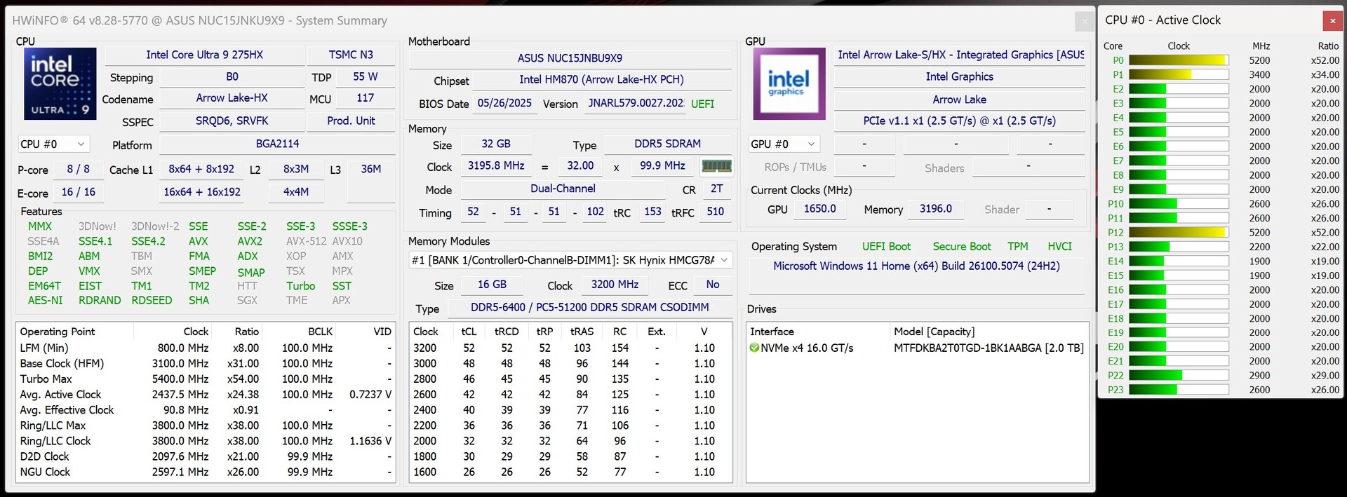 英特尔酷睿 Ultra 9 275HX 是英特尔目前在移动领域提供的最佳处理器之一。在我们的 CPU 基准测试中,华硕 ROG NUC 15 的表现也令人印象深刻。无论是单核性能还是多核性能都堪称完美,没有任何弱点。即使是全新的、同样极其强大的 AMD Ryzen AI Max+ 395(在 博世游戏 M5)也经常被击败。