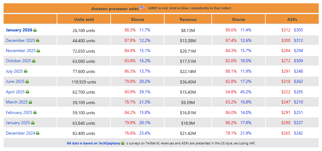 2026 年 1 月,美国亚马逊共售出 26100 件 CPU,表面上看似乎还不错。但是,如果我们将 2026 年 1 月的 CPU 销量与 2025 年 1 月进行比较,就会发现一个令人担忧的趋势:许多消费者/玩家并没有升级。