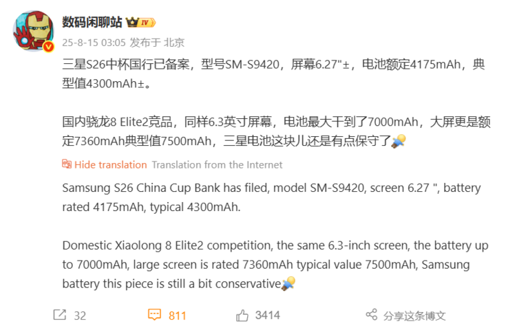 与 Galaxy S25的电池容量与 小米 15之间的电池容量差距已经非常明显。至少根据中国泄密者 "数码聊天站"(Digital Chat Station)在发表的一篇文章,这种差距将在 2026 年进一步拉大。中国泄密者 "数字聊天站"(Digital Chat Station)发表的一篇文章,其中报道了Galaxy S26 在中国的首次认证。
