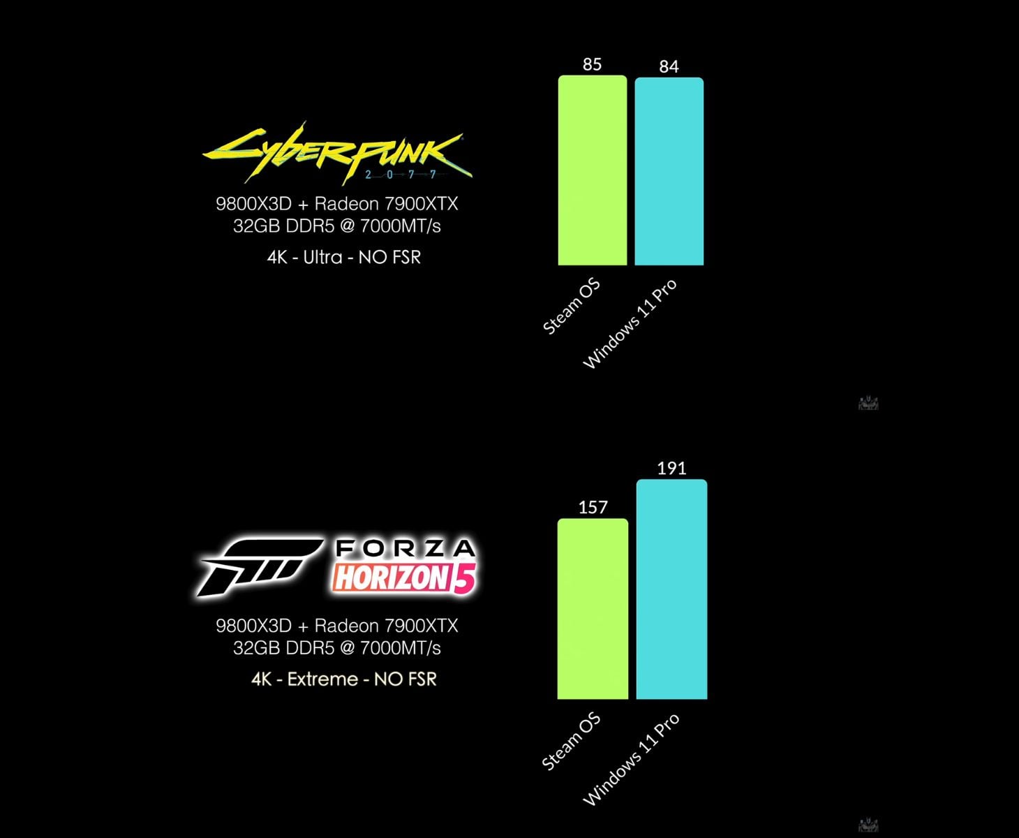 为了进行直接比较,ETA Prime 在两个操作系统上使用相同的设置运行了几款游戏。在 赛博朋克 2077中,Windows 11 的平均帧数为 84 FPS,而 SteamOS 则为 85 FPS,两个平台的性能不相上下。