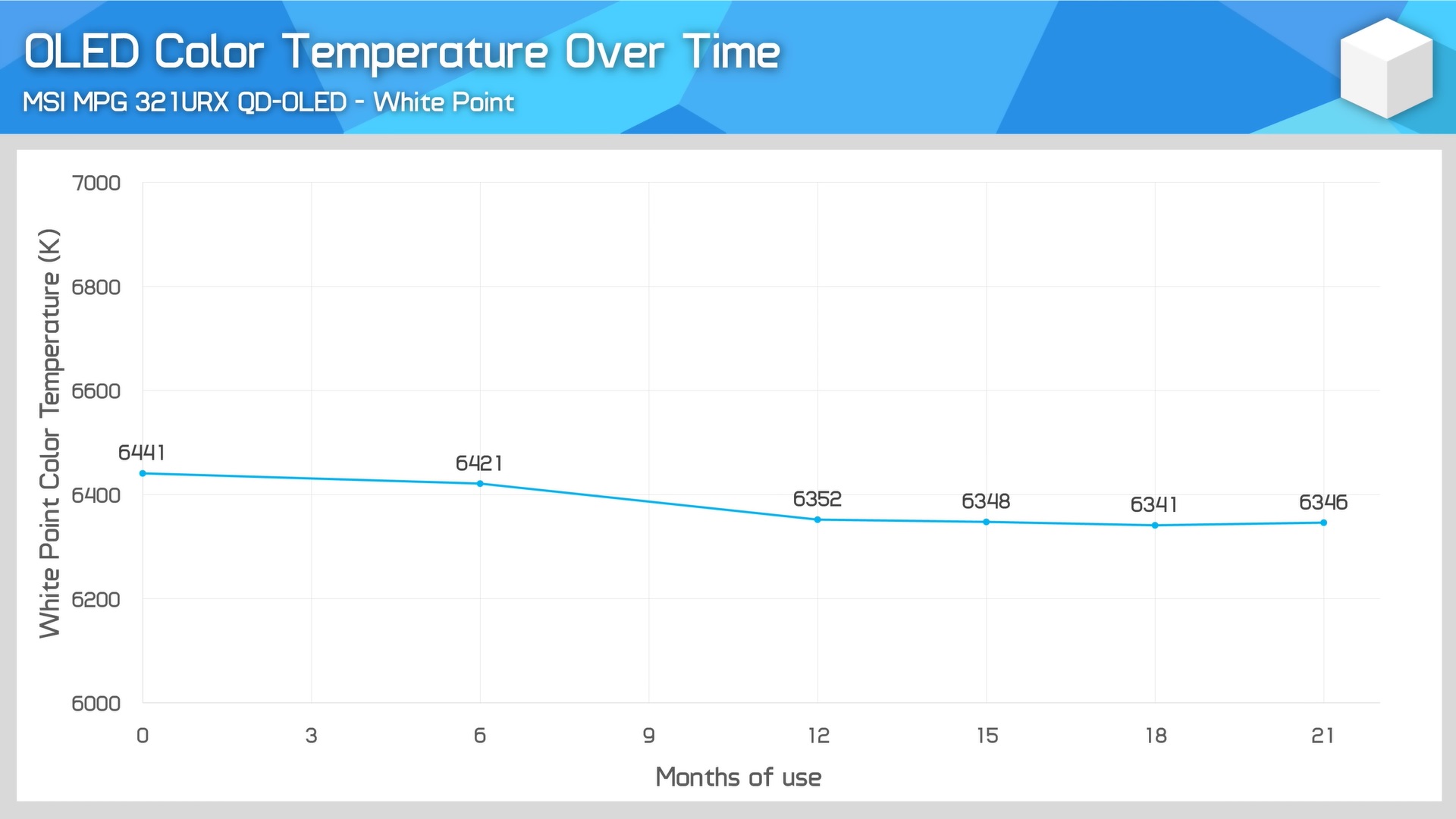 与上一次更新一样,最明显的假象仍然是 Windows 任务栏、两个并排应用程序之间的分界线以及右侧放置最常用静态应用程序的地方出现的倦怠。与 18 个月的更新类似,MU 也报告说绿色子像素的恶化似乎最严重,其次是蓝色子像素,然后是红色子像素。不过,微星 MPG 321URX QD-OLED 游戏显示器的色温没有进一步偏离。
