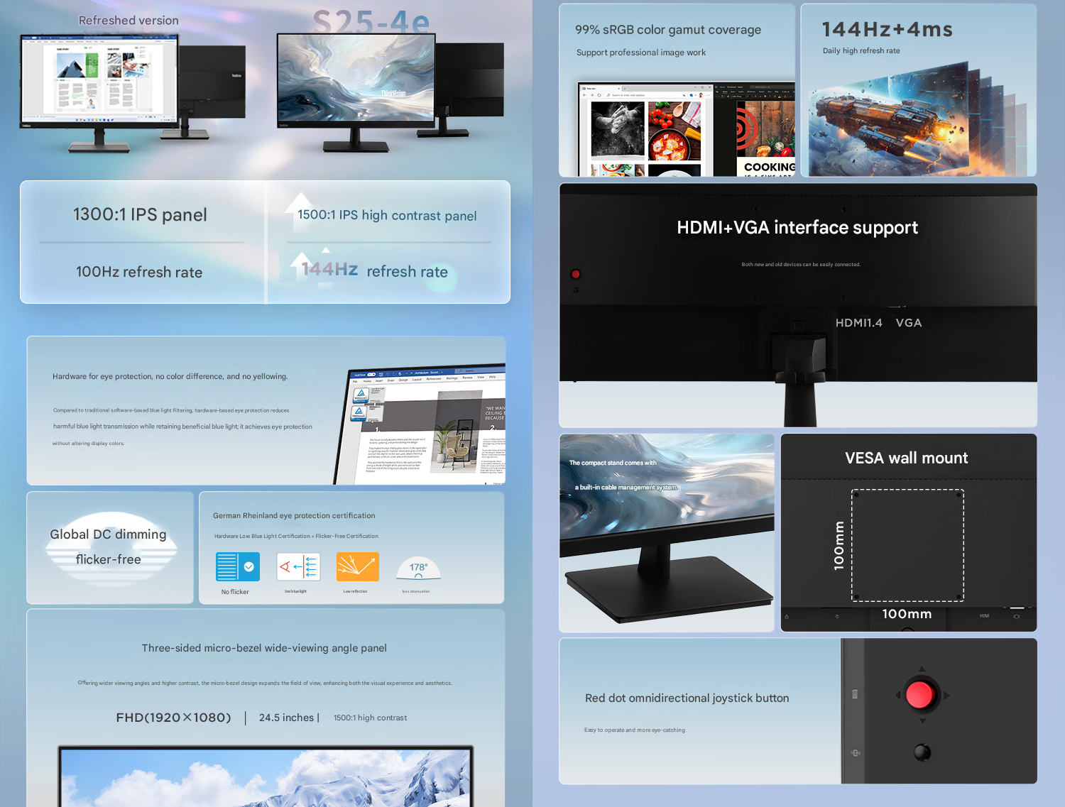 与高端显示器不同,联想这款经济型显示器的连接选项并不多。具体来说,ThinkVision S25-4e 只有一个 HDMI 1.4 接口和一个 VGA 端口.其他亮点还包括用于系统导航的标志性红色操纵杆按钮、VESA 支持(华诺 VESA 双显示器支架目前在亚马逊的售价为 59.99 美元)以及相对时尚的设计。