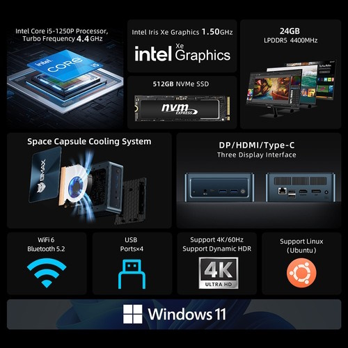 尽管如此,这款迷你电脑的尺寸约为 5 x 4.4 x 2 英寸,应能轻松放入任何设置中。生产商宣传说,它的散热系统由一个风扇和两根热管组成,能使英特尔酷睿 i5-1250P 处理器的温度保持稳定。 英特尔酷睿 i5-1250P处理器的温度。虽然这不一定是高端处理器,但它的速度足以满足所有典型应用的需求,包括 Microsoft Office 和照片编辑。此外,24GB LPDDR5 内存的主频为 4400MHz,内置的 NVMe PCIe SSD 具有 512GB 的存储容量。