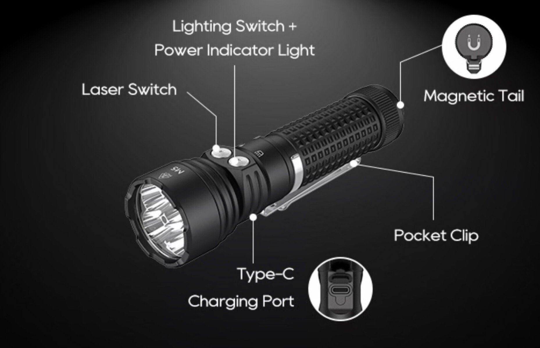 乍一看,TerraBeast M5 手电筒似乎并不起眼,黑色铝合金外壳通过了 IP66 认证,这意味着它可以掉进水里而不会损坏。不过,它的一个不同寻常之处在于内置了激光。