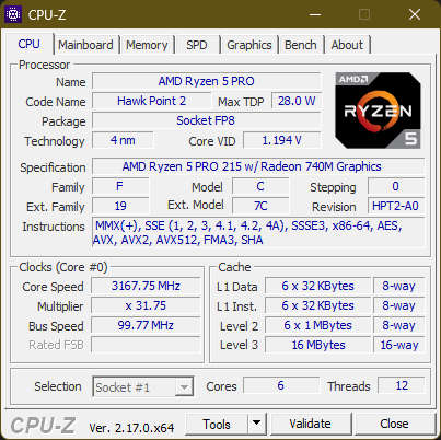 AMD Ryzen 5 Pro 215 是一款采用 SMT 技术的六核 CPU,拥有 12 个线程。这款 Zen4 "鹰点 "芯片是该系列中最弱的六核 CPU,主频为 3.2 至 4.7 GHz。与众不同的是,它没有任何 NPU。进一步的基准比较可参考我们的 CPU 基准测试列表.