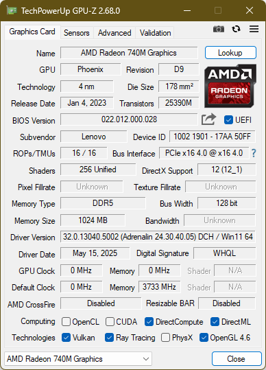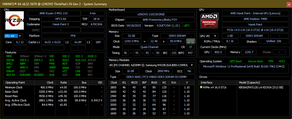 | Lenovo ThinkPad L16 Gen 2 21SC0029GE R5 PRO 215, Radeon 740M, Kioxia BG6 KBG6AZNV512G, LED IPS, 1920x1200, 16" | Lenovo ThinkPad L16 Gen 1 21L70010GE R7 PRO 7735U, Radeon 680M, SK Hynix HFS001TEJ9X164N, IPS, 1920x1200, 16" | HP EliteBook 8 G1a 16 AI Ryzen AI 7 PRO 350, Radeon 860M, Micron 3500 MTFDKBA512TGD, IPS, 1920x1200, 16" | Lenovo ThinkPad T16 Gen 4 21QQS06M00 Ryzen AI 7 PRO 350, Radeon 860M, SK hynix PC801 HFS001TEJ9X162N, IPS, 1920x1200, 16" | Lenovo ThinkBook 16 G7 QOY 21NH0005GE SD X Plus X1P-42-100, Adreno X1-45 1.7 TFLOPS, WD PC SN740 512GB SDDPMQD-512G-1101, IPS LED, 1920x1200, 16" | Average AMD Radeon 740M | Average of class Office | |
