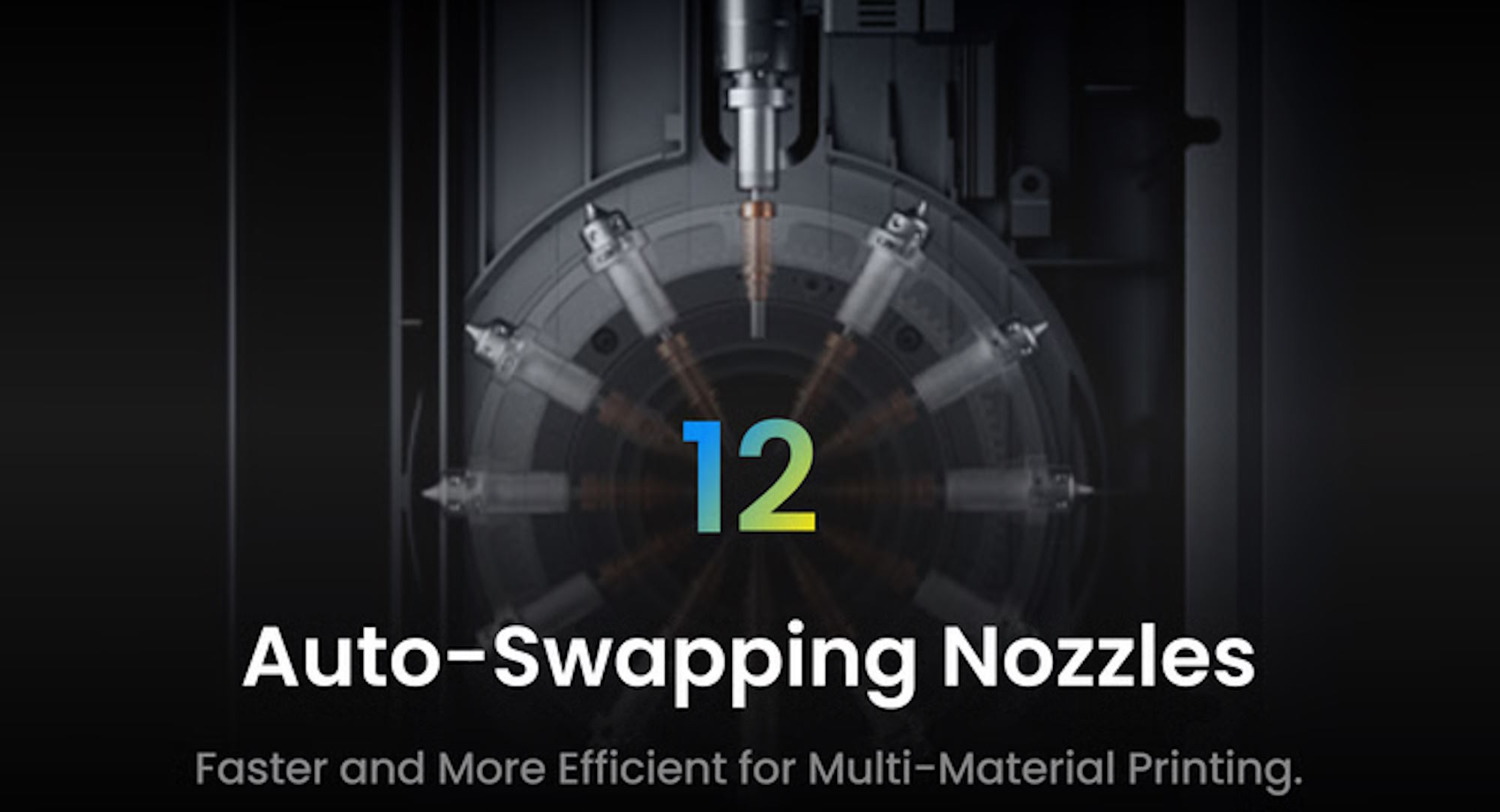 这些喷嘴可以自动交换,这在使用多种长丝或颜色进行打印时非常有利。通常情况下,更换喷嘴需要剪断并重新装入长丝。据称,有了这些可互换的打印喷嘴,废弃材料的数量最多可减少 90%,所需的时间也可减少 50%。