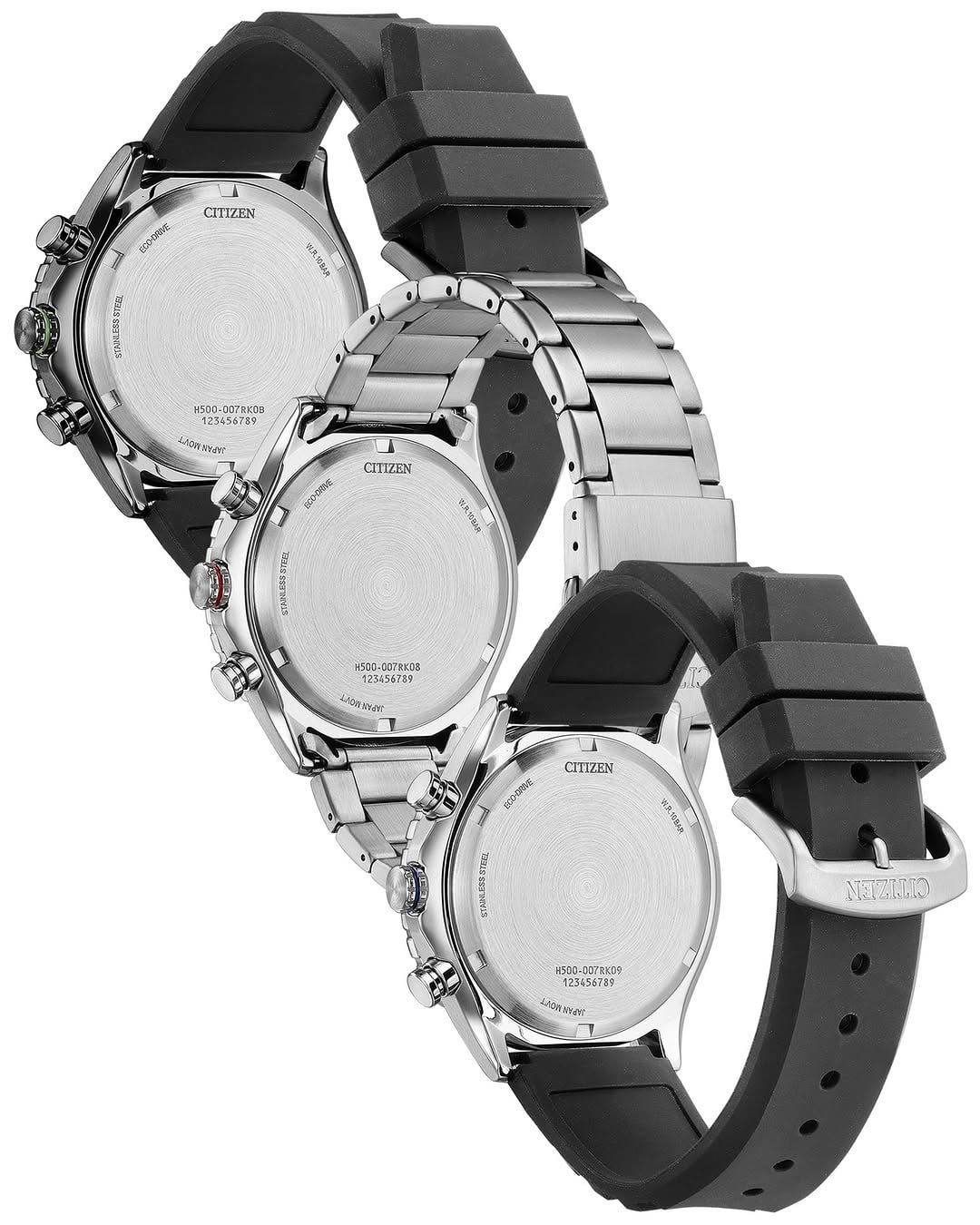 H500 Eco-Drive 机芯是这些产品的机械基础。作为太阳能石英引擎,H500 可将任何光源转化为电能,在充满电的情况下可提供 150 天的动力储备,额定月精度为 ±15 秒。该机芯支持长达 60 分钟的 1 秒计时码表,2 点钟位置设有 24 小时小表盘,4 点钟位置设有日期窗口。该机芯还具有充电不足警告功能,当电池电量耗尽时,秒针会以两秒的间隔移动。