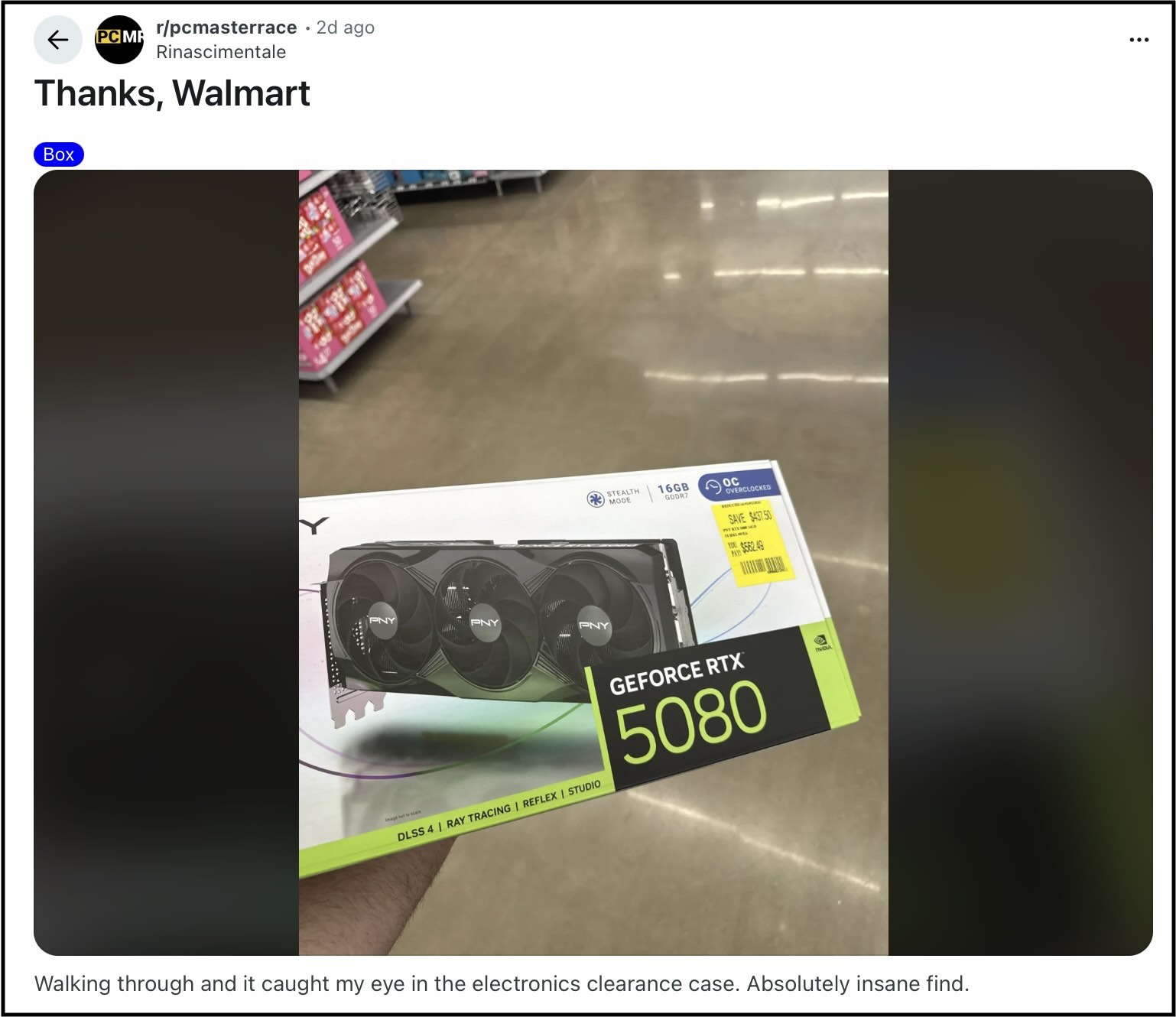 不过,正如我们之前所报道的,不少发烧友和游戏玩家已经设法找到了令人震惊的 优惠的游戏硬件。其中一位玩家在当地沃尔玛的清仓货架上以 562 美元的价格买到了一块 PNY RTX 5080 三风扇显卡。