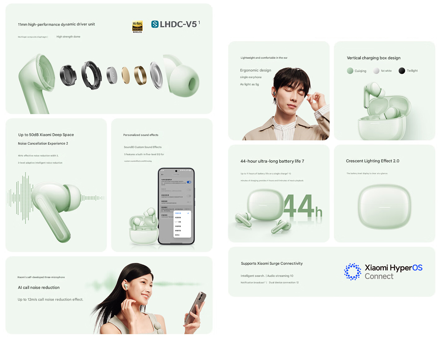 至于声音设置,小米指出 ANC 耳机配备了一个 11 毫米动态驱动器配置,带有 "多层复合振膜"。支持 LHDC V5,使耳塞获得了 Hi-Res Audio Wireless 认证,但值得注意的是,这种编解码器主要由中国智能手机支持。
