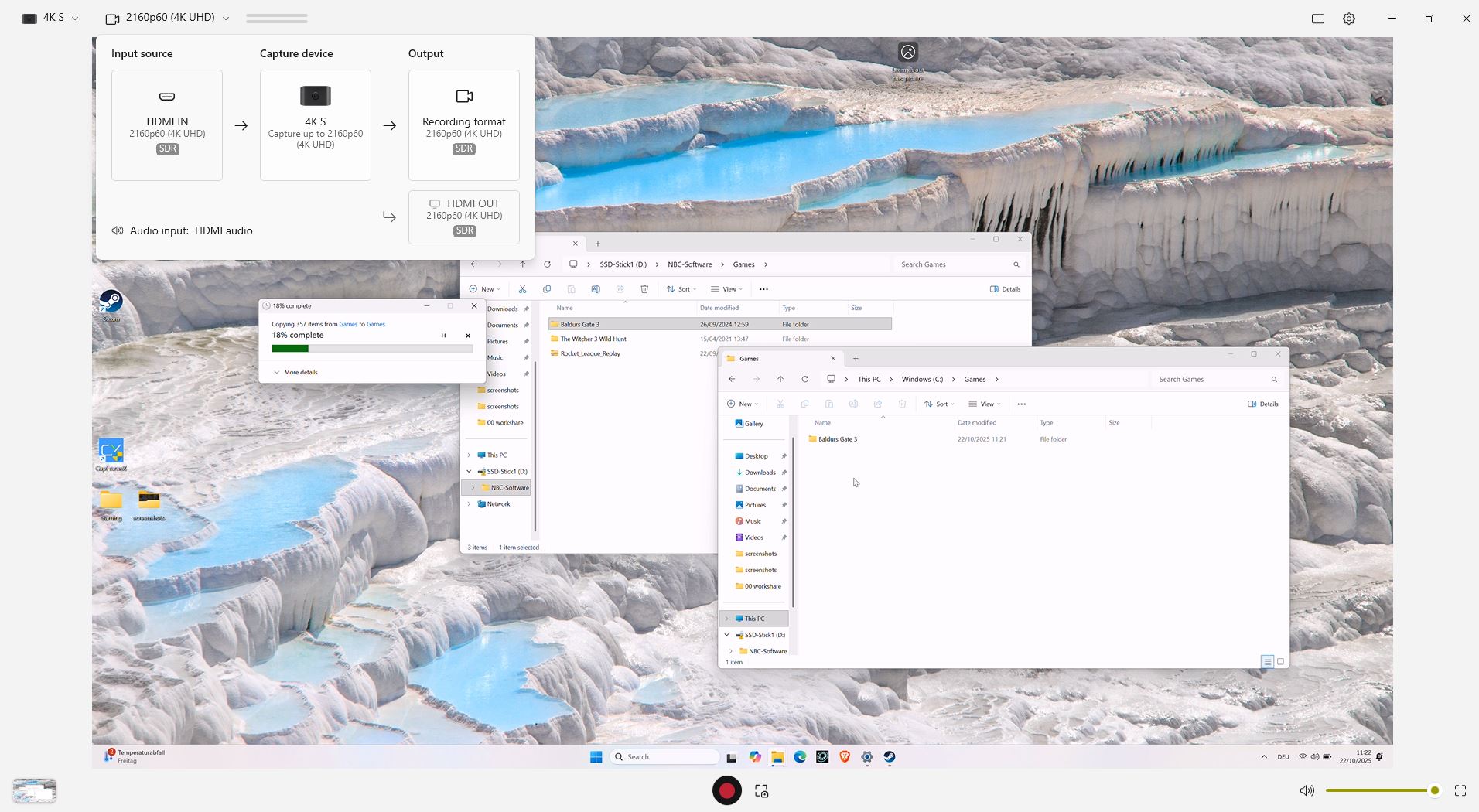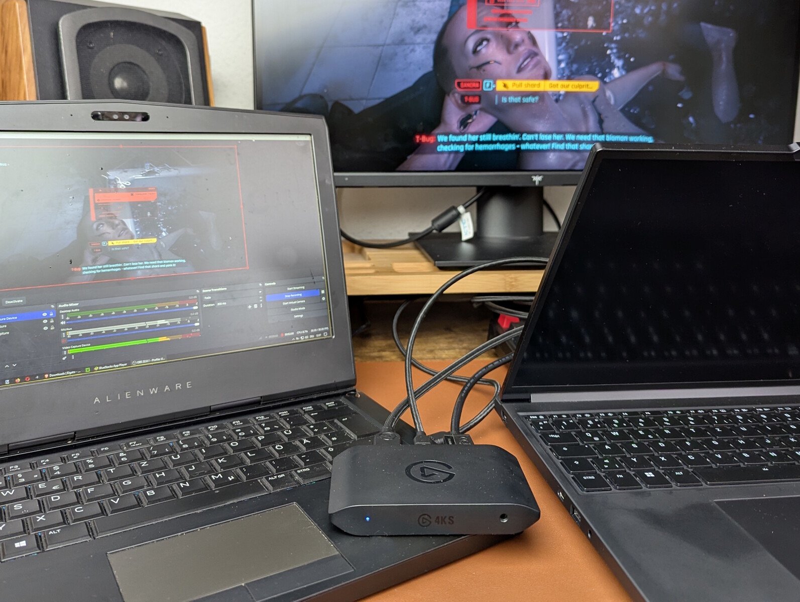 - 电脑游戏捕捉:我们将 XMG Pro 16 游戏笔记本电脑连接到 4K S,以 4K 格式录制《赛博朋克 2077》的游戏。第二台笔记本电脑通过 USB-C 连接到采集卡,负责在 Elgato 应用程序或 OBS 中进行录制。我们还查看了延迟情况。