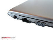 Despite the fact that the height of the base unit doesn't exceed two centimeters, Samsung has still included a full-fledged RJ-45 Gigabit Ethernet port, and a normal VGA port. Other slim notebooks such as the Samsung 770Z7E and the Asus U38DT require adapters (in the case of the VGA port) or moving parts (Ethernet port) to enable their use. An HDMI port, Kensington Lock slot and a card reader (SD, SDHC, SDXC) are of course also all on board.