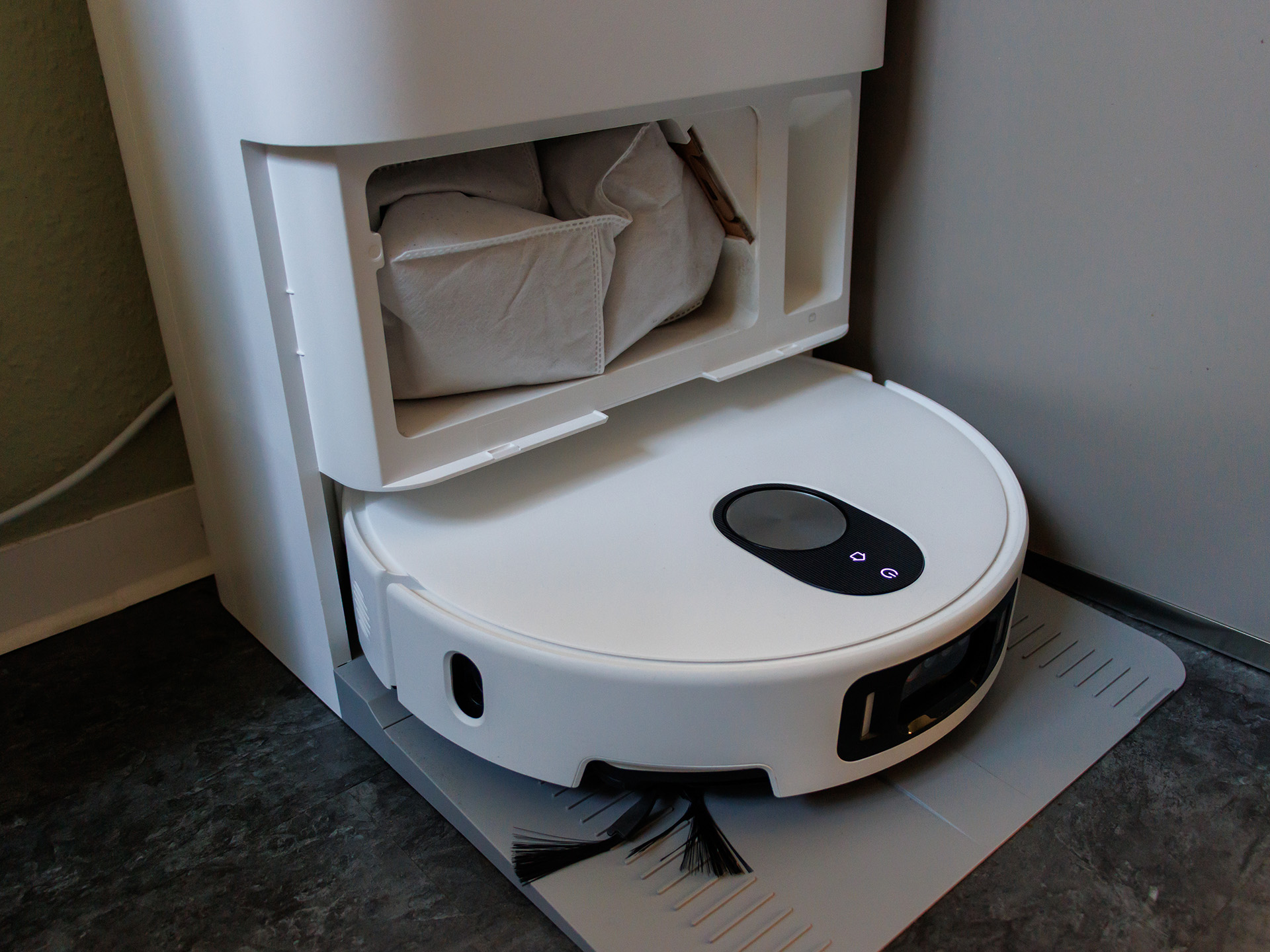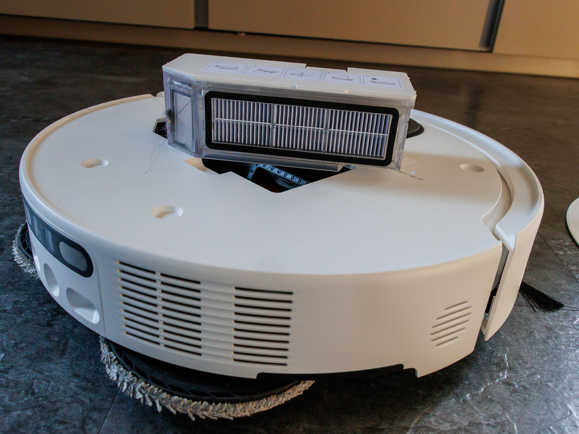 在前部,有一个人工智能三摄像头设置,由 RGB 和红外摄像头加上 3D 红外点阵投影仪组成,旨在实时检测 200 多个物体。这在日常使用中通常能稳定工作,但乐高小砖块经常被忽视,甚至一枚 1 便士硬币最后也被放进了集尘袋。在测试过程中,机器人真空吸尘器在探测沙发下的电缆时也遇到了问题。
