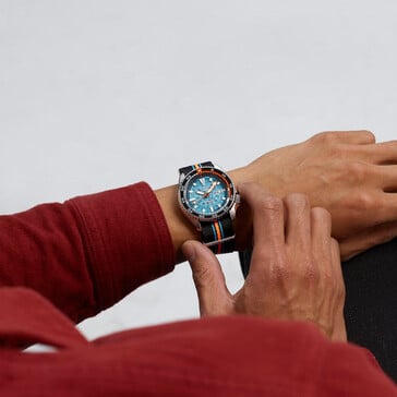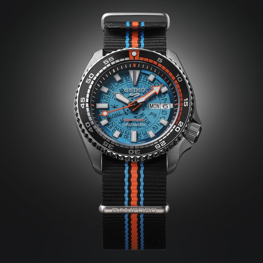 这款限量版腕表参考了精工 5 Sports "SKX "系列的档案,以 "复古未来 "为设计主题。镂空表盘上有多个明亮(和非传统)的班福德灵感线索,最引人注目的是茶色表盘,表面和尼龙表带上都有大胆的橙色、蓝色和白色元素点缀。指针、刻度和表圈均经过夜光处理。6 点钟位置、表壳背面和表带的定制金属环上都有 Bamford 标志。表背为透视设计,上面有独立的序列号。