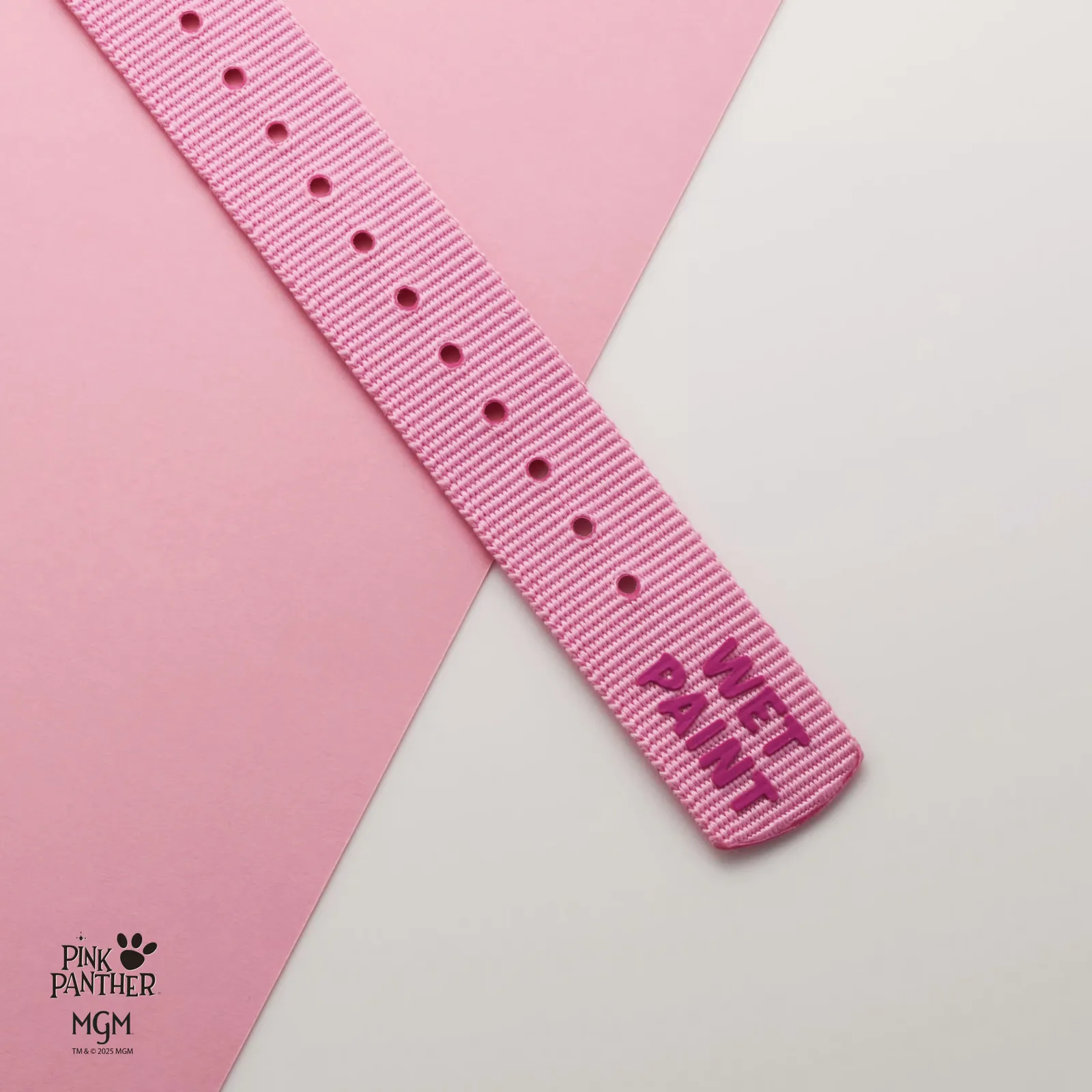 首先,表盘应该会吸引人们的眼球。表盘是饱和的粉红色调,表面压有粉红豹的爪印。秒针也是粉红色的,表圈内嵌的粉红色分钟刻度与黑色圆环形成鲜明对比。三点钟位置设有日期视窗,指针采用标准的 5 Sports 设计。背面的粉色展示窗显示出黑豹的眼睛和印在玻璃上的人物标志。
