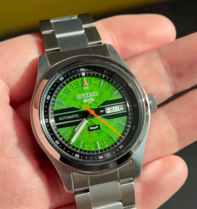 精工 5 Sports SRPM09 HUF 限量版在本月早些时候推出后的首次上手拍摄中浮出水面。 本月早些时候推出在二月推出后的首张上手照片。它展示了以 "时间声纳 "为灵感的半透明绿色表盘。