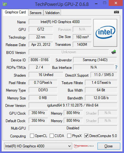 In addition to the integrated GMA 4000 HD graphics unit, Samsung's ultrabook also sports a dedicated GPU. AMD's Radeon HD 8750M clocks with a core rate of 825 MHz, is based on the GCN architecture (28 nanometers), offers 2 GB of memory and is aimed at casual gamers who need a stronger graphics card than the one integrated. The GPU supports DirectX 11.1, Shader 5.0 and automatic graphics switching. Thus, the processor-integrated GPU is automatically enabled for more basic tasks. Detailed information about the 8750M can be found in our tech article for this graphics unit.