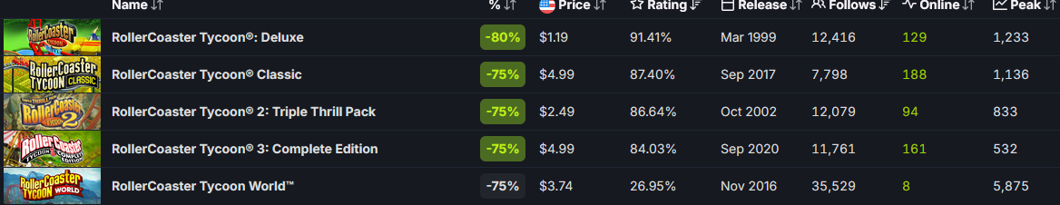 1999 年的首款游戏《过山车大亨豪华版》(RollerCoaster Tycoon Deluxe)目前的售价为 1.19 美元。该游戏仍然保持着 "压倒性好评",94% 的评论都是正面的。在过去的 30 天里,这款游戏的同时在线人数达到了 422 人的高峰。其续作《过山车大亨 2:三重刺激包》售价为 2.49 美元,对于那些使用社区驱动的 OpenRCT2 现代引擎的玩家来说应该会很不错。