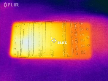 (±) The maximum temperature on the upper side is 42.7 °C / 109 F, compared to the average of 35.2 °C / 95 F, ranging from 21.9 to 247 °C for the class Smartphone.