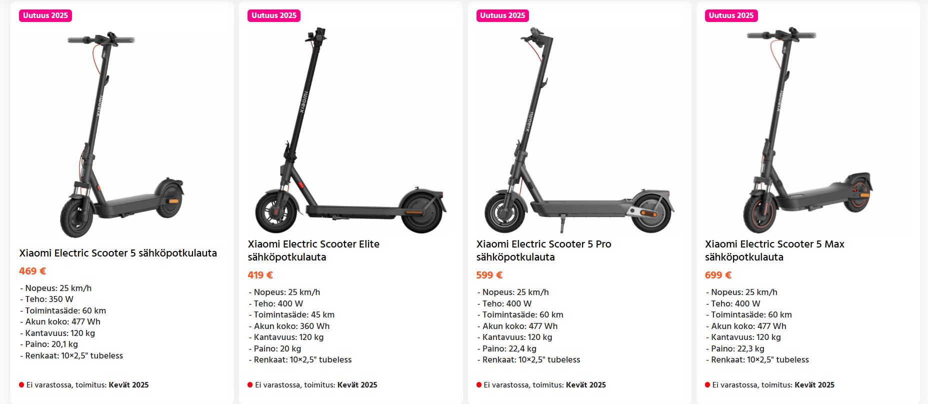 爱好者论坛 escooter-treff 援引芬兰零售商店 "Sahkopotkulaudat "的消息称,小米将推出电动滑板车 5、电动滑板车 Pro 和电动滑板车 5 Max。该商店还列出了一款以前从未听说过的型号--电动滑板车 Elite。
