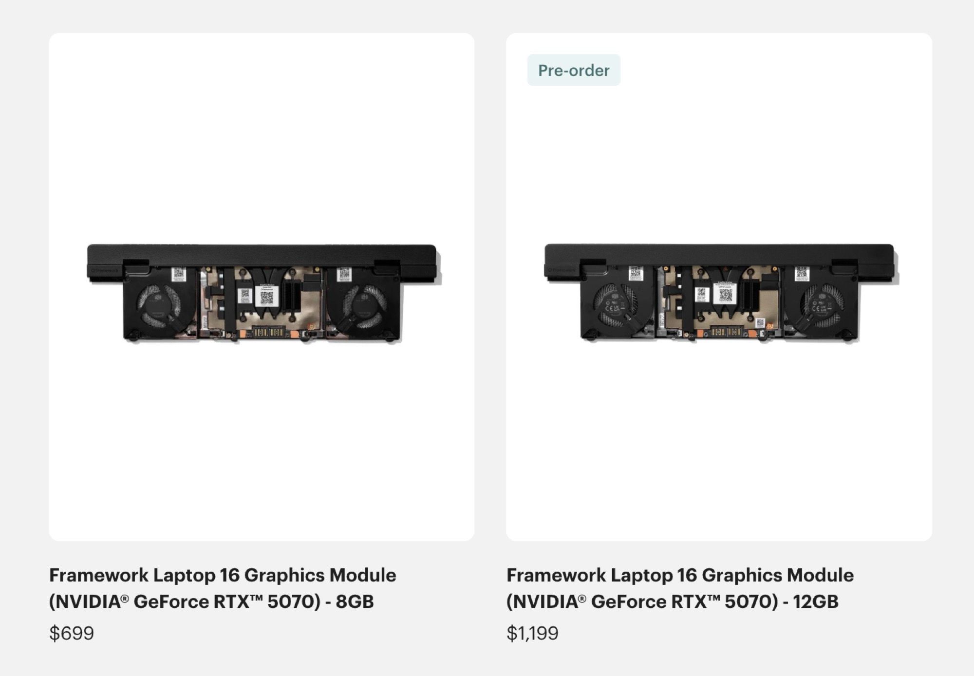 首批搭载新版GeForce RTX 5070 的游戏笔记本将在未来几周内开始发货,但 Nvidia 尚未正式公布价格。框架现在已经开放了GeForce RTX 5070 12 GB 升级模块的预订,该模块用于 Framework Laptop 16,将于 6 月开始交付。价格高得出人意料--GeForce RTX 5070 12 GB 售价 1199 美元,而不是 8 GB 显存版本的 699 美元。这意味着客户要为 4 GB 或 50% 以上的 VRAM 支付 500 美元或 71.5% 的附加费。