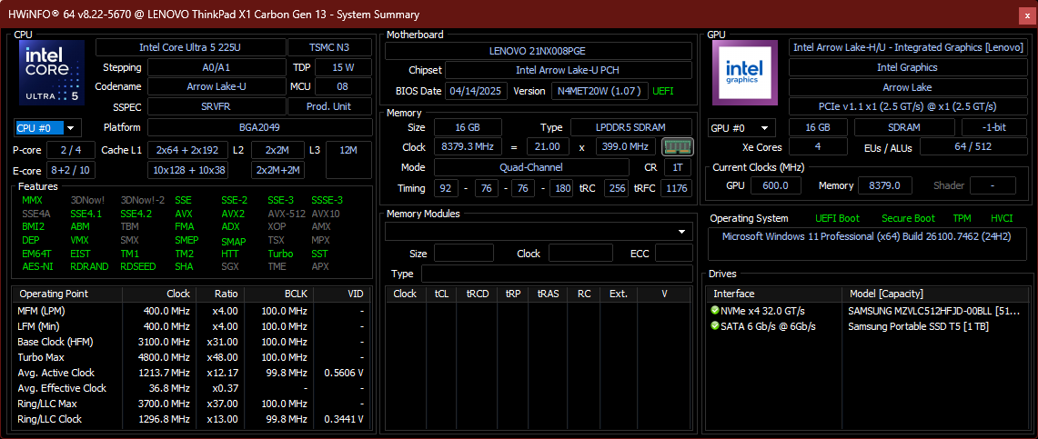 | Lenovo ThinkPad X1 Carbon Gen 13 21NX008PGE Intel Core Ultra 5 225U ⎘ Intel Graphics 4-Core iGPU (Arrow Lake) ⎘ 16 GB Memory, 512 GB SSD | Amazon: $1,649.99 List Price: 1955 Euro | 1.2 kg | 17.5 mm | 14.00" 1920x1200 162 PPI IPS LED | |