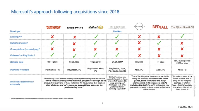 在美国联邦贸易委员会(FTC)起诉微软一案的相关文件中 起诉微软微软收购动视暴雪一案的相关文件中,有一页很有意思。Axios 的斯蒂芬-托蒂洛(Stephen Totilo)在推特上发布了该页面的截图,其中详细列出了贝塞斯达开发的多款游戏的预计发布日期和平台。